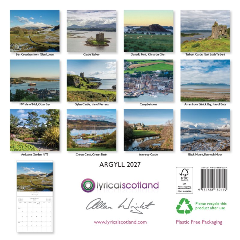Our 2027 selection of images for Argyll are: Ben Cruachan from Glen Lonan; Castle Stalker; Dunadd Fort, Kilmartin Glen; Tarbert Castle, East Loch Tarbert; MV Isle of Mull, Oban Bay; Gylen Castle, Isle of Kerrera; Campbeltown; Arran from Ettrick Bay, Isle of Bute; Arduaine Garden, NTS; Crinan Canal, Crinan Basin; Inveraray Castle; Black Mount, Rannoch Moor. |