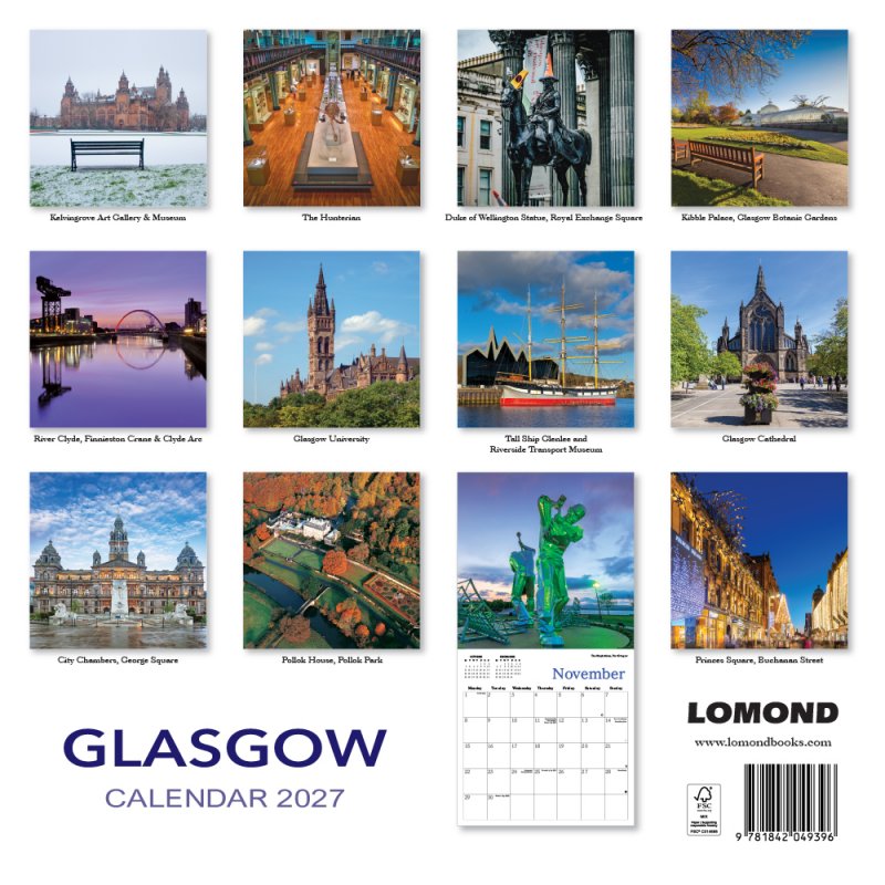 The selection of stunning images of Glasgow included are: Kelvingrove Art Gallery & Museum; The Hunterian; Duke of Wellington Statue, Royal Exchange Square; Kibble Palace, Glasgow Botanic Gardens; River Clyde, Finnieston Crane & Clyde Arc; Glasgow University; Tall Ship Glenlee and Riverside Transport Museum; Glasgow Cathedral; City Chambers, George Square; Pollok House, Pollock Park; The Shipbuilders, Port Glasgow; Princes Square, Buchanan Street.