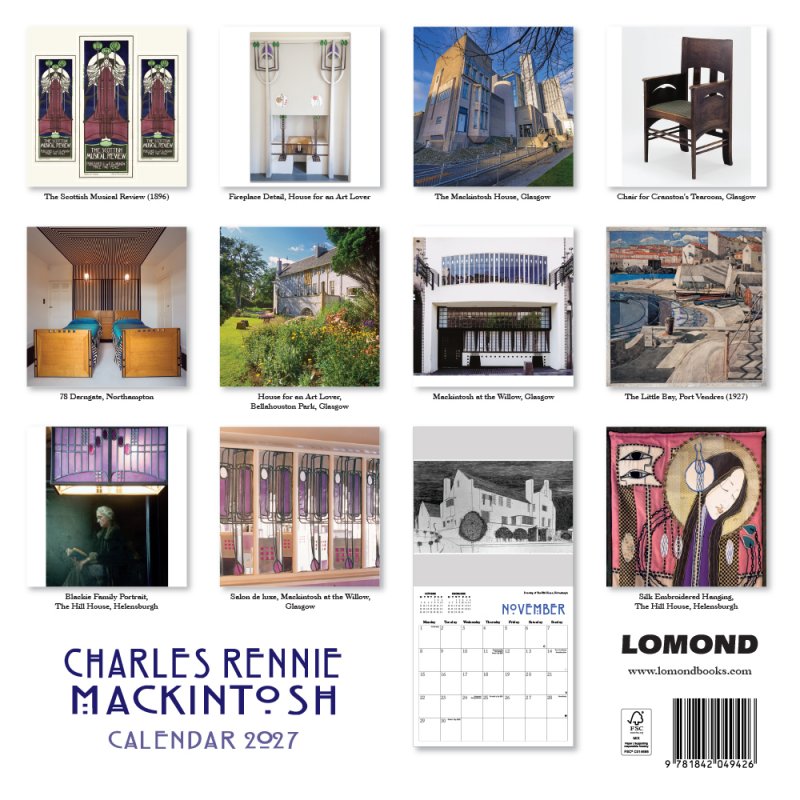 The selection of stunning images of Charles Rennie Mackintosh’s art and architecture included are: The Scottish Musical Review (1896); Fireplace Detail, House for an Art Lover; The Mackintosh House, Glasgow; Chair for Cranston’s Tearoom, Glasgow; 78 Derngate, Northampton; House for an Art Lover, Bellahouston Park, Glasgow; Mackintosh at the Willow, Glasgow; The Little Bay, Port Vendres (1927); Blackie Family Portrait, The Hill House, Helensburgh; Salon de luxe, Mackintosh at the Willow, Glasgow; Drawing of the Hill House, Helensburgh ; Silk Embroidered Hanging, The Hill House, Helensburgh.
