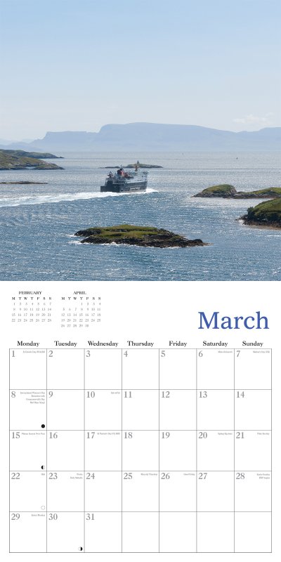 The selection of stunning images of Scotland included are: The Cuillin Hills, Loch Scavaig, Skye; Eilean Mhuire, Lismore, Argyll; MV Hebrides, Tarbert, Harris; Lochranza Castle, Arran; Traigh Seilebost, Harris; Tobermory, Mull; Iona; Vatersay, Outer Hebrides; Sealladh Tùrnan, North Uist; The Italian Chapel, Orkney; Rum from Eigg; Ailsa Craig & Pladda, from Kildonan, Arran.