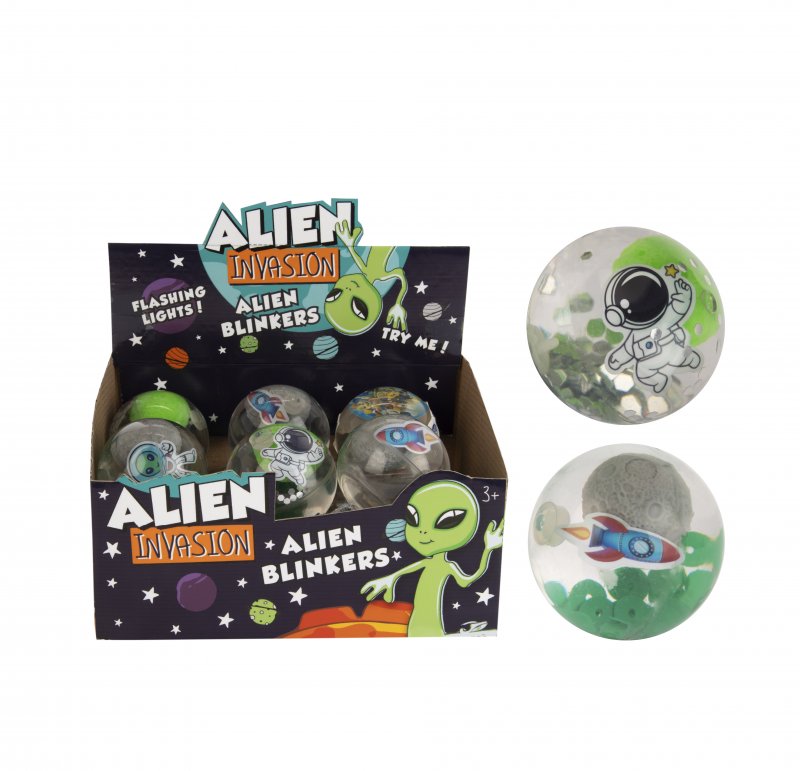 Bouncy balls containing little aliens inside. Sold in a counterpack of 12.