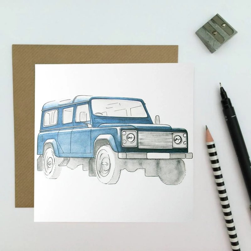 A contemporary watercolour illustration, featuring a Land Rover. This card has been left blank inside, for your own personal message.