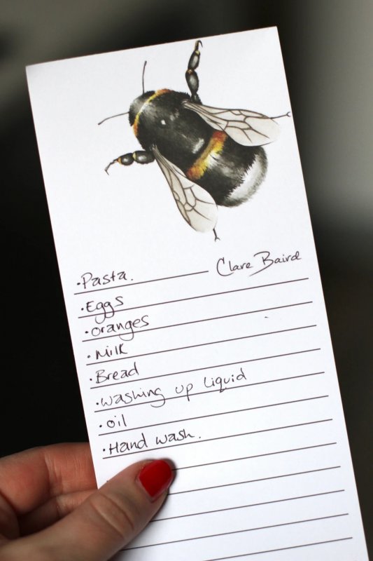 Get rid of mind clutter with this super organised list pad featuring the wonderful watercolour paintings of Scottish artist Clare Baird. This pad features the bumblebee design. A great way to spill out things to do, things to remember and things to achieve in the busy lives we now lead. Made from 100gsm quality paper with a magnetic back, simply pop it on the fridge so it’s always handy when you need it.