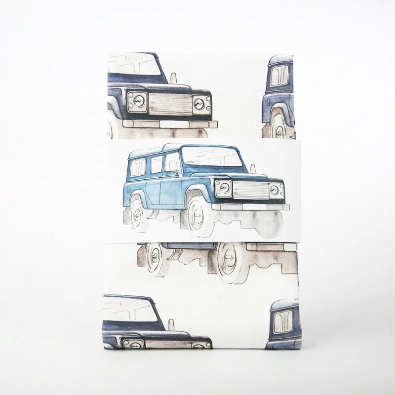 Cotton tea towel featuring a repeating pattern of Scottish artist Clare Baird's vibrant and modern painting. This design features Land Rovers.