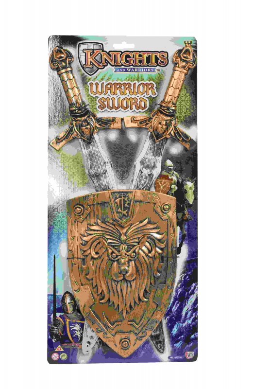 Plastic sword and shield play set on knight themed packaging.