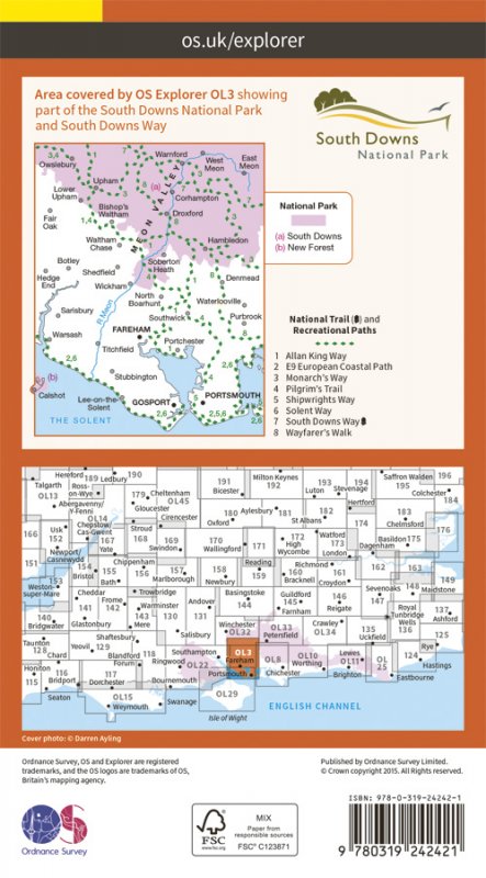 With a wealth of naval history behind it Portsmouth lies at the southern edge of this map that stretches north taking in Fareham, Waterlooville, Droxford and Owslebury. This map also provides coverage of a south westerly section of the South Downs National Park. There are a number of Recreational Paths, including part of the South Downs Trail, Solent Way, Kings Way, Pilgrim's Trail and Wayfarers Walk. Explorer OL3 replaces Explorer 119, and covers the same area. |
