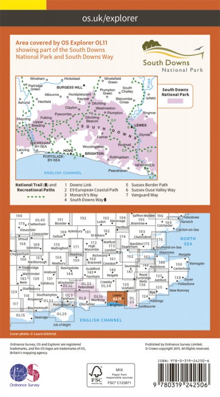 Map sheet number OL11 in the OS Explorer map series is ideal for those seeking adventure in the Brighton and Hove area. The coast can be explored by foot taking in the sights and sounds of Brighton, Hove, Portslade, Shoreham by Sea, Peacehaven and Newhaven on the way. The countryside in this area offers walkers rolling Sussex Downs, pretty villages and plenty of stunning scenery to admire, as well as parts of the South Downs Way. This map replaces the previous Explorer sheet 122 for this area. |