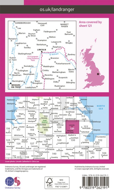 OS Landranger map 121 of Lincoln & Newark-on-Trent also includes Market Rasen, Saxilby, Scampton, Sutton on Trent, Ruskington, Waddington, Wragby, Branston, Coleby, Hemswell Cliff and part of the E2 European Long distance path.