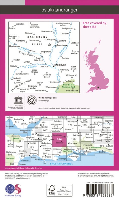 Map sheet number 184 in the OS Landranger map series is perfect for planning days out in and around the Salisbury area. Wide open spaces are in abundance in this area so visitors to the area will enjoy some spectacular views. Highlights of the area include: Stonehenge, Salisbury, Parsonage Down National Nature Reserve, and Old Sarum. The map covers an area of 40 km by 40 km (25 miles by 25 miles). |