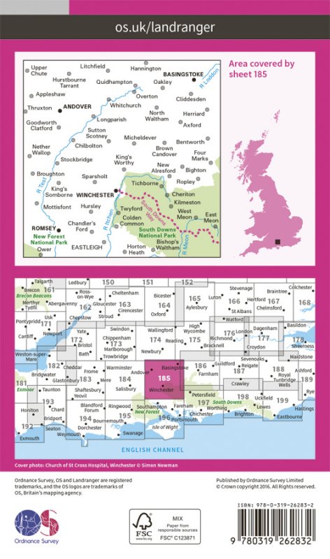 Map sheet number 185 in the OS Landranger map series is the ideal map to use when planning a day out around the Winchester and Basingstoke area. With plenty of cultural and city attractions alongside pleasant countryside, this area appeals to all types of outdoors enthusiast. Highlights of the area include: Winchester Cathedral, The South Downs Way, The Basingstoke Canal Heritage Footpath, Andover, and Romsey Abbey. The map covers an area of 40 km by 40 km (25 miles by 25 miles). |