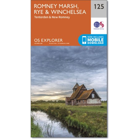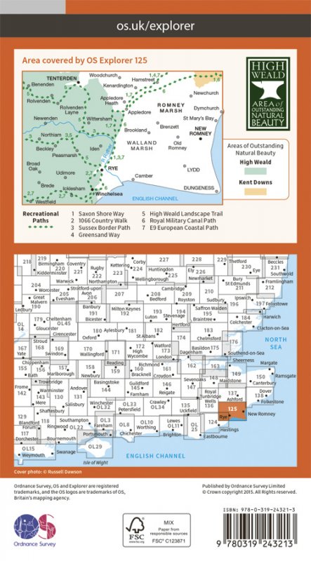 Map sheet number 125 in the OS Explorer series covers High Weald between East Sussex and Kent on the south coast of England. The map covers an area from Tenterden, New Romney and Rye, and includes walks such as Saxon Shore Way, the 1066 Country Walk and Sussex Border Path. |