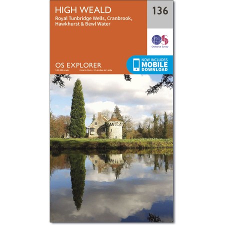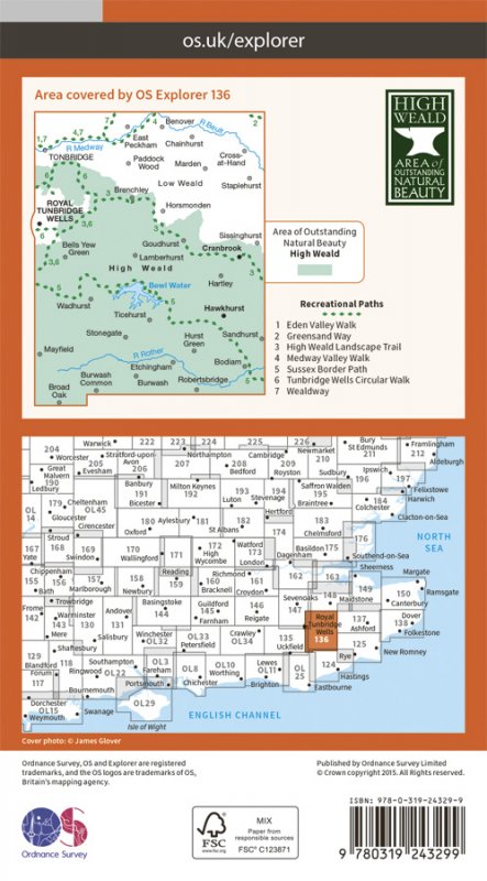 The High Weald is an area of Kent classed as an Area of Outstanding Natural Beauty. OS Explorer map 136 covers hawkhurst, Royal Tunbridge Wells and Tonbrige. Recreational paths featured are Eden Valley Walk, Greensand Way, High Weald landscape Trail, Medway Valley Walk, Sussex Border Path, Tunbridge Wells Circular walk and Wealdway. |