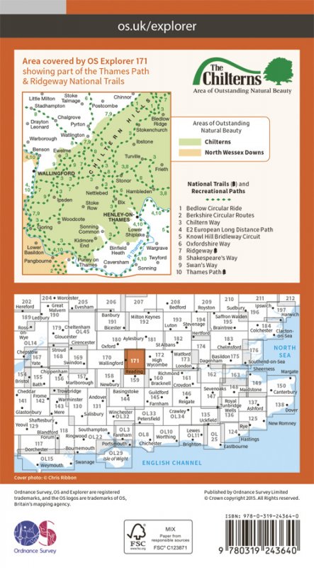 Map sheet number 171 in the OS Explorer series covers Henley-on-Thames, Wallingford, Purley-on-Thames, Watlington, Caversham. Highlights of the area include: the Chilterns and North Wessex Downs, the Chiltern Way, Thames Path, River Thames and a section of the Ridgeway. |