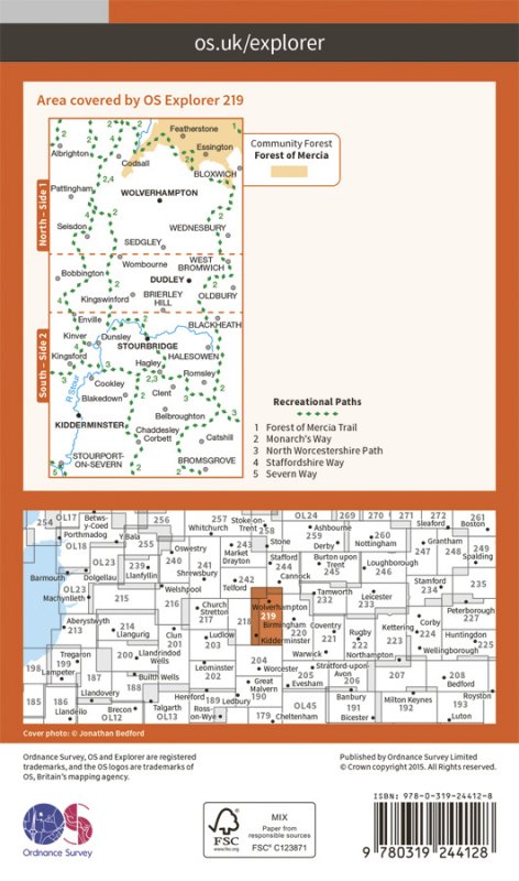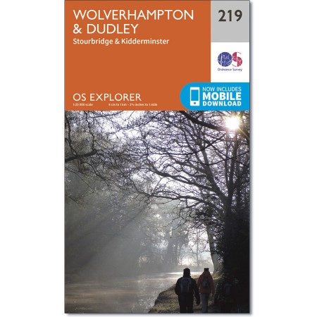 Map sheet number 219 covers Wolverhampton, Dudley, Stourbridge and Kidderminster. Highlights include the Forest of Mercia and River Stour. Also includes Halesowen, Bromsgrove, Brierley Hill, Wednesbury and Bloxwich.