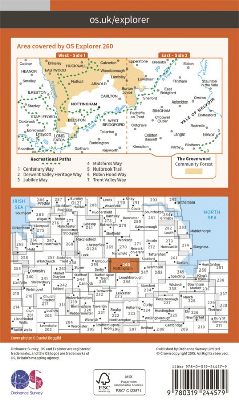 This is a two sided map that follows the River Trent from Long Eaton to Bleasby, including Nottingham. This area has segments of a number of Recreational paths, including the Robin Hood Way and Trent Valley Way.