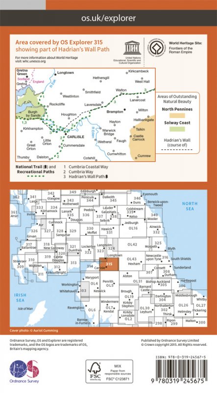 Taking in Dalston, Carlisle, Gretna Green and Longtown this map also covers part of the Solway Coast and North Pennines Areas of Outstanding Natural Beauty. National Trails and Recreational Paths covered are: Cumbrian coastal Way, Cumbria Way and Hadrian's Wall Path. |