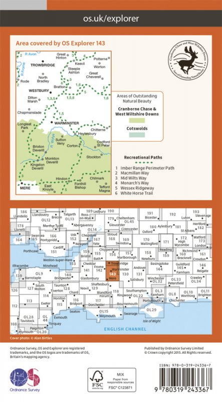Map sheet number 143 in the OS Explorer series covers the west of Wiltshire, taking in Cranbone Chase & West Wiltshire Downs. Highlights of the area include: Mid Wilts Way, Wessex Ridgeway, Monarch's Way and Imber Range Perimeter Path.