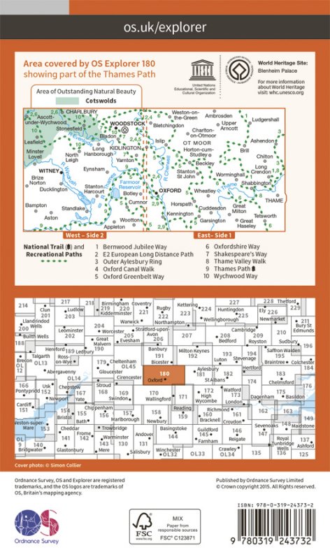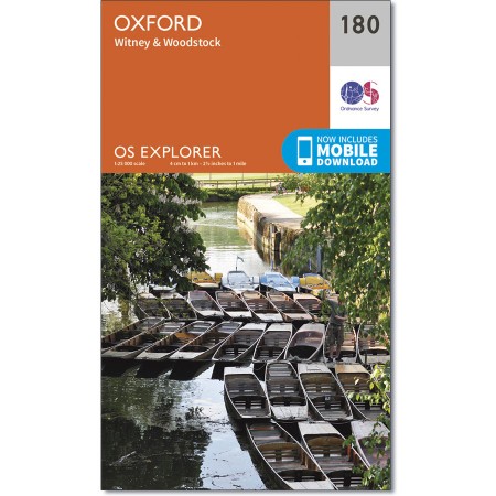 Map sheet number 180 in the OS Explorer series covers Oxford, Woodstock, Witney, Thame, Kidlington and Ot Moor. Highlights of the area include: rivers Thame, Evenlode, Cherwell and Windrush, the south west corner of the Cotswolds AONB, part of the Thames Path and the Oxford Canal Walk. |