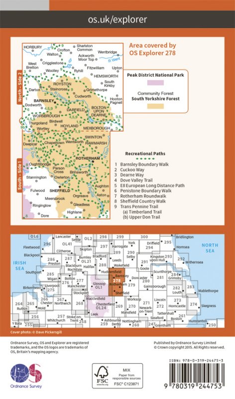 Map sheet number 278 in the OS Explorer map series is ideal for discovering The South Yorkshire Forest around Sheffield, Rotherham and Barnsley. round Ripon and Boroughbridge. Staying in Sheffield gives you easy access to the Peak District, and there are many other recreational paths in the area to discover. Other highlights of the area include: Royston, Asont and Thurgoland. |