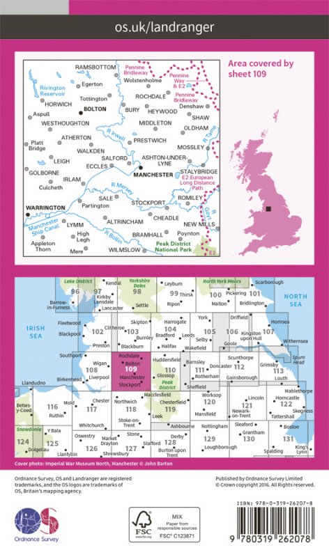 Map sheet number 109 in the OS Landranger map series is the ideal map for planning days out and holidays around Manchester and the North West of England. This area, just on the edge of the Peak District National Park has urban settlements such as Manchester, Salford, Rochdale, Oldham, Bolton and Warrington, along with smaller towns such as Stalybridge, Cheadle, Altrincham, Ashton-under-Lyme, Wilmslow and Denshaw. |