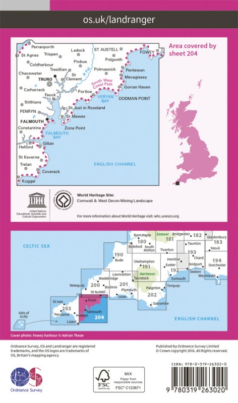 In the far south-west on England, the OS Landranger 204 of Truro & Falmouth also includes St Austell, Dodman Point, Gillan, Penryn, Feock, Ladock, Trispen, Coldharbour, Portloe and part of the South West Coast Path. Cornwall has been attracting visitors for centuries, impressing them with it's mild climate, rolling hills and rugged coastlines. |