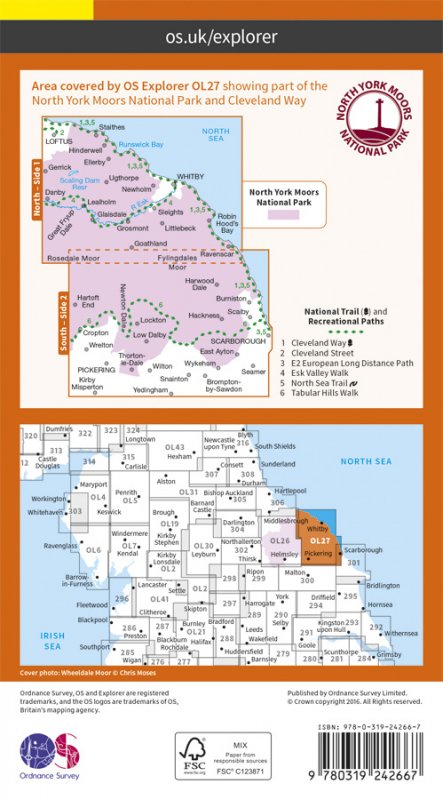 OS Explorer sheet OL27 covers the North York Moors National Park, including the Cleveland Hills and The Hambleton Hills. Also on this map sheet are the Celeveland Way National Trail, Tabular Hills Walk, Cleveland Street, Esk Valley Walk and the northern end of Ebor Way. |