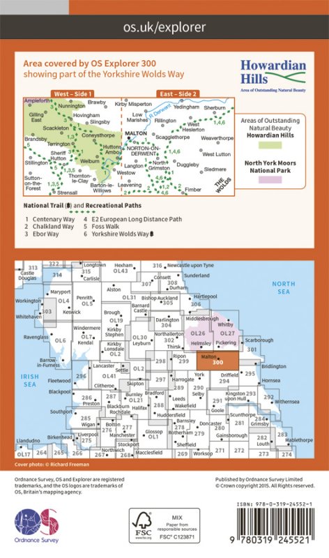 Centred around Malton, OS Explorer Map 300 contains parts of the Howardian Hills and The Wolds. With ample opportunities for exploring both the countryside (including part of the Yorkshire Wolds Way) and historic buildings such as Castle Howard, it's ideal for walking, bycycling or horse riding. |