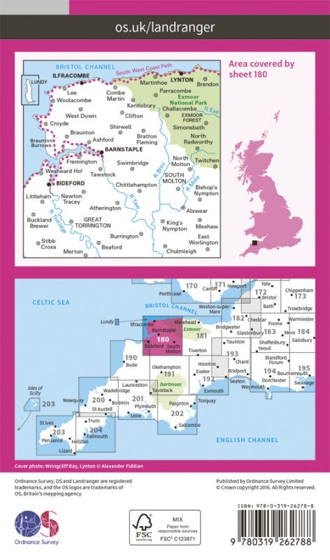 OS Landranger map 180 shows the northern coast of Devon, on the Bristol Channel. It includes the western end of Exmoor National Park, as well as a section of the South West Coast Path. The area has long been popular for holidays, with seaside towns like Ilfracombe, Bideford and Lynton attractive all year round. Move inland to Barnstaple and smaller villages to discover secluded valleys and campsites. |
