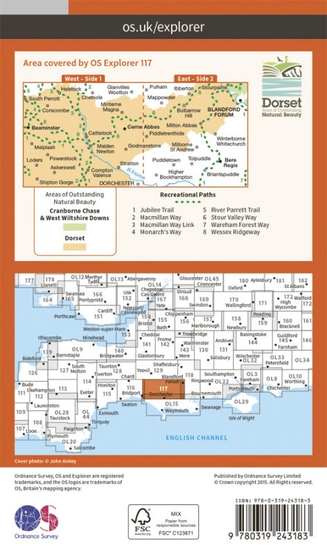 Taking in Bere Regis, Blanford Forum, Cerne Abbas and Beaminster this map provides coverage of some of Dorset classed as an Area of Outstanding Natural Beaurty. It also covers sections of some popular recreational paths:- Jubilee Way, Macmillan Way, Macmillan Way Link, Monarch's Way, River Parrett Trail, Stour Valley Way, Wareham Forest Way, Wessex Ridgeway and the Cerne Abbas giant.. |