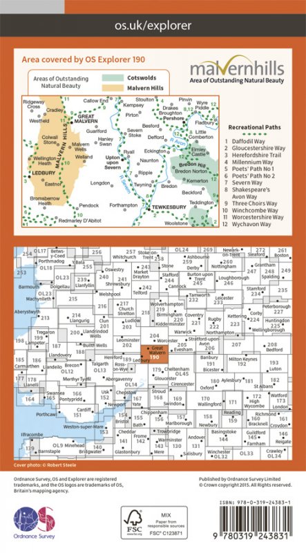 Map sheet number 190 in the OS Explorer series covers two areas of Outstanding Natural Beauty; the Cotswolds and the Malvern Hills and the settlements of Great Malvern, Upton upon Severn, Ledbury, Pershore and Tewkesbury. Also includes sections of the River Severn and the River Avon and Bredon Hill.