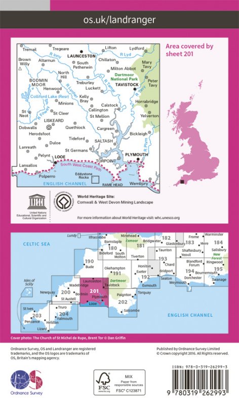 Map sheet number 201 in the OS Landranger map series is the ideal map to use when planning trips to Plymouth, Launceston, Tavistock and Looe. Plymouth holds many attractions with its rich maritime history and the attractive countryside surrounding it. Highlights of the area include:- The National Aquarium, The Tamar Valley, Launceston, Liskeard |