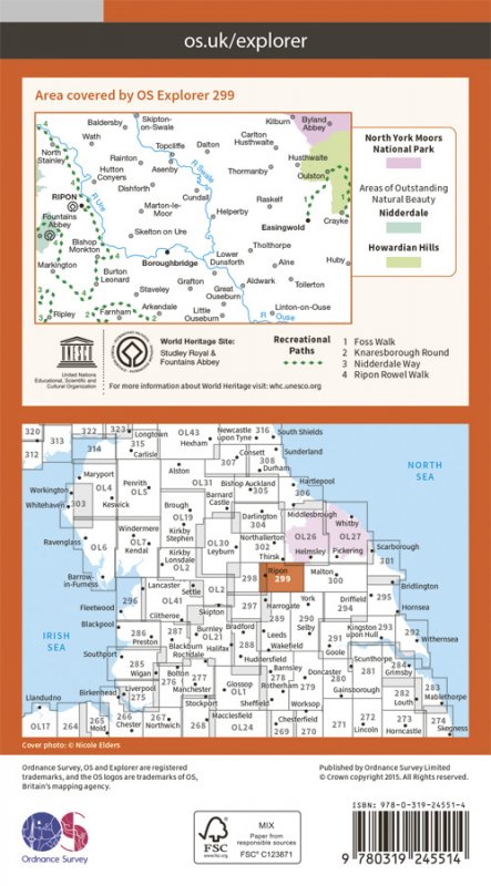 Map sheet number 299 in the OS Explorer map series is ideal for discovering North Yorkshire around Ripon and Boroughbridge. Visit the cathedral city of Ripon and see the Ripon market, or the Ripon Hornblower, a tradition from the middle ages. Other highlights of the area include: Easingwold, Fountains Abbey and Grafton. |