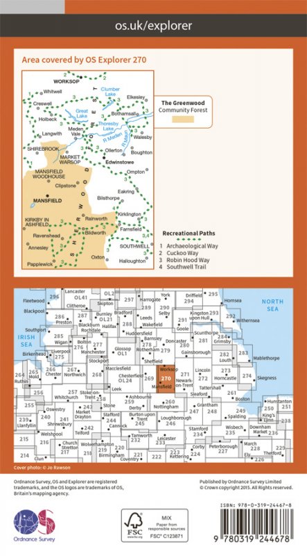 Famously the home of Robin Hood, Explorer map 270 shows the appropriately named Robin Hood Way. The Greenwood Community Forest has outdoor adventures for old and young alike, while the ancient town of Mansfield has the ruins of a 12th century palace. |