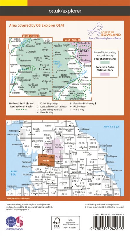 Map sheet OL41 in the OS Explorer series covers the Forest of Bowland and Yorkshire Dales National Park near Clitheroe. Highlights of the area include: Ribble Way, Wyre Way, Lune Valley Ramble and Pendle Way, along with the towns of Clitheroe, Settle and Lancaster. |