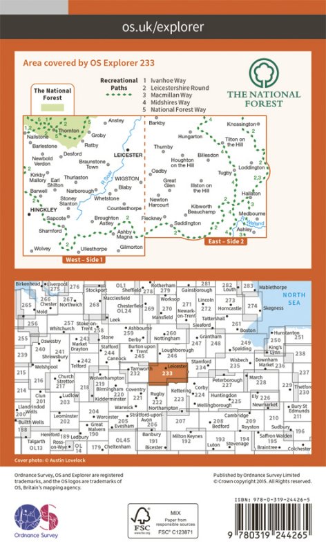 OS Explorer Map 233 covers Hinckley, Leicester and the surrounding towns and villages. As well as the Leicestershire Round and Midshires Way, this area contains numerous toutes for walking, cycling and riding.