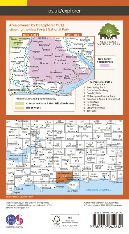 Map sheet number OL22 in the OS Explorer map series is the perfect map for holiday makers and day trippers to use when visiting the New Forest. The national park is famous for its excellent walks and rides and is home to New Forest ponies and heath land scenery. |