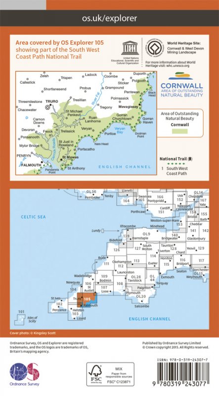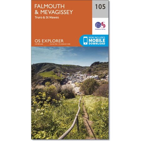 Map sheet number 105 in the OS Explorer map series is the ideal map for walks, hikes and rides around Falmouth, Mevagissey, Truro and St Mawes. The South West Coast Path is an ideal way to explore the coastline in this part of Cornwall. Highlights of the area include: Pendennis Point, Lost Gardens of Heligan, Mevagissey, Veryan Bay, and Falmouth Bay. |