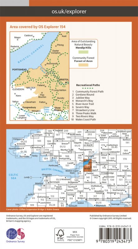 Map sheet number 154 in the OS Explorer map series is ideal for discovering the area from Bristol towards the Bristol Channel, separating England and Wales. The Forest of Avon and a small section of the Mendip Hills are covered by this map, wlong with towns such as Portishead and Clevedon near the Bristol Channel, and Congrebury and Chew Magna further inland. |