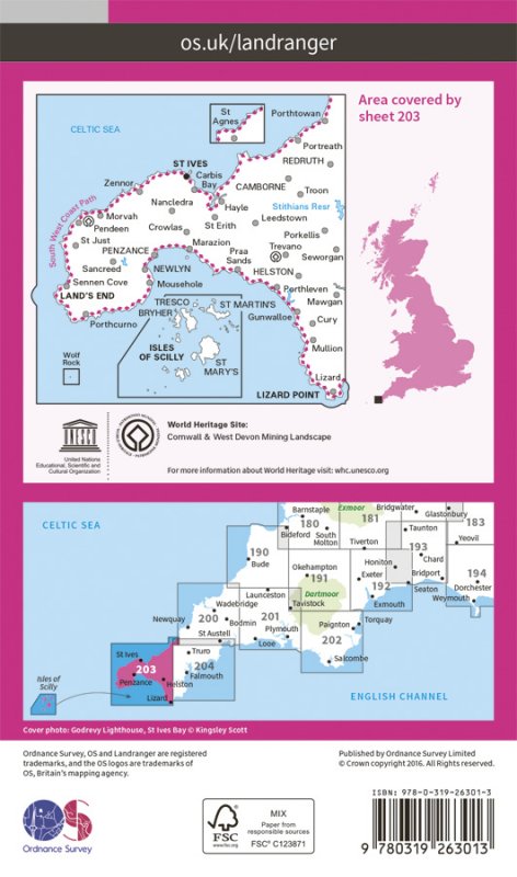 Map sheet number 203 in the OS Landranger map series is the ideal map to use when planning a day trip or holiday to Land's End, Isles of Scilly, St Ives and Lizard Point. There are many attractions in the area from picturesque villages to coastal walks. Highlights of the area include:- Tate Gallery, St Ives, Cromwell's Castle, Tresco, Lizard Point, Newlyn |