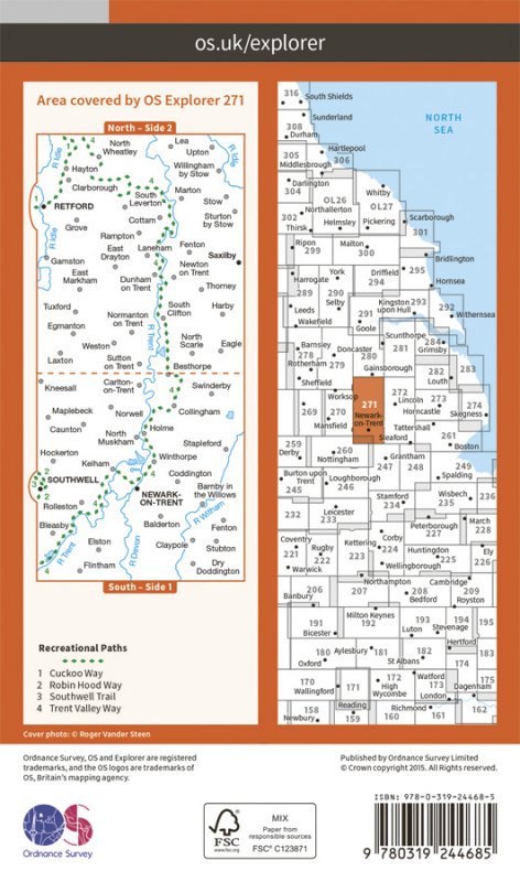 Double sided OS Explorer map 271 shows Retford to Southwell and Newark-on-Trent. his is includes the Trent Valley Way, and parts of Cuckoo Way, Robin Hood Way and Southwell Trail.