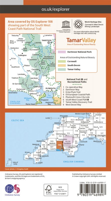 Map sheet number 108 in the OS Explorer series covers the south coast area between Devon and Cornwall area around Plymouth. With a section of Dartmoor National Park along with the Areas of Outstanding Natural Beauty of Cornwall, South Devon and the Tamar Valley, this is an area with lots to discover. Highlights of the area include: South West Coast Path, Dartmoor Way, Erme Plym Trail and the towns of Tavistock, Callington and Saltash.