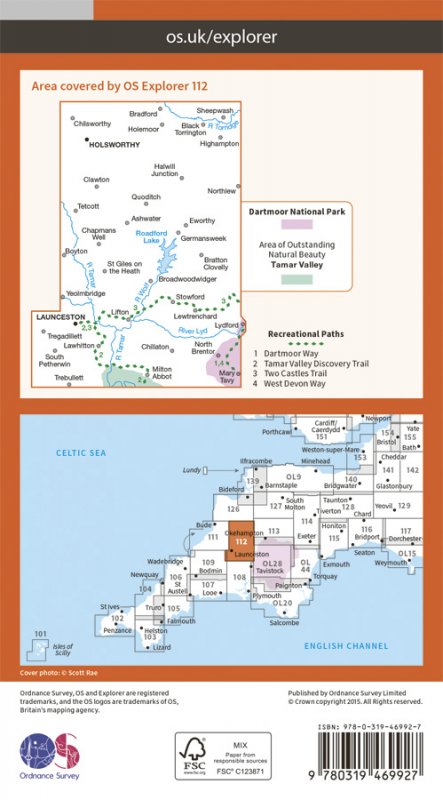 Map sheet number 112 covers Holsworthy and Launceston. Highlights include Dartmoor National Park, Tamar Valley and Roadford Lake. Also includes Sheepwash, Milton Abbot, Lifton and Chapmans Well.