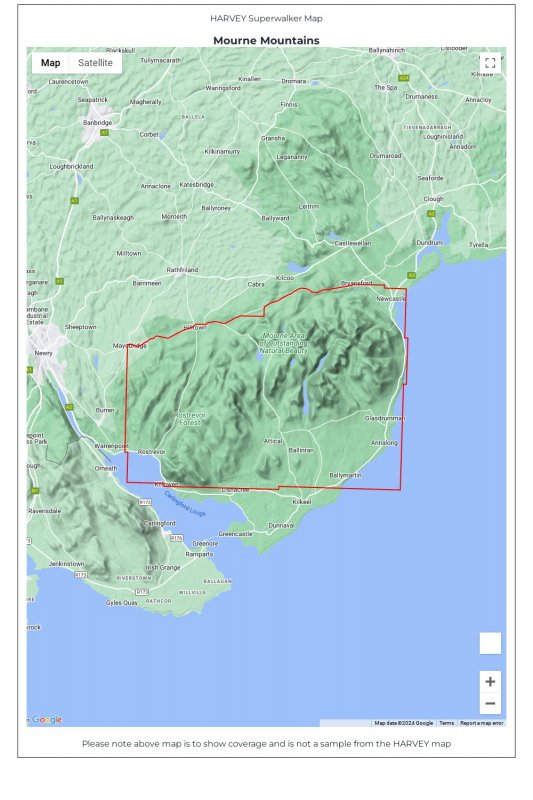 The Mournes, a granite mountain range in County Down, includes the highest mountains in Northern Ireland. The highest is Slieve Donard at 850 metres. Detailed map for hillwalkers of the Mountains of Mourne at 1:25,000 scale. The Mournes is an Area of Outstanding Natural Beauty and has been proposed as the first national park in Northern Ireland. The area is partly owned by the National Trust and sees a large number of visitors every year. The Mourne Wall is among the more famous features in the Mournes. It is a 35km (22mls) drystone wall that crosses fifteen summits, constructed in 1904 and completed in 1922 to define the boundaries of land purchased by the Belfast Water Commissioners in the late 1800s. Includes The Mourne Way Long Distance Footpath. |