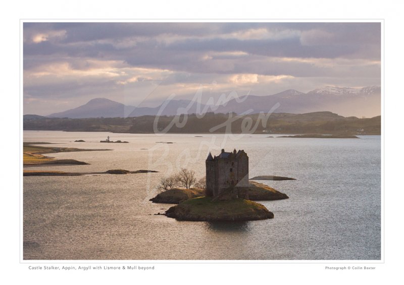 A classic Medieval Tower-House from the 15th Century, and one of the best preserved in the west of Scotland, picturesque Castle Stalker clings to Eilean an Stalcaire, ‘Island of the Hunter’, overlooking Loch Linnhe. The islands of Lismore & Mull form the backdrop to this popular view. A4 size quality print ready for framing. Prints sold as singles. Supplied with backing board and colour information sheet on reverse, all in a polypropene bag. (CB Ref P019) |