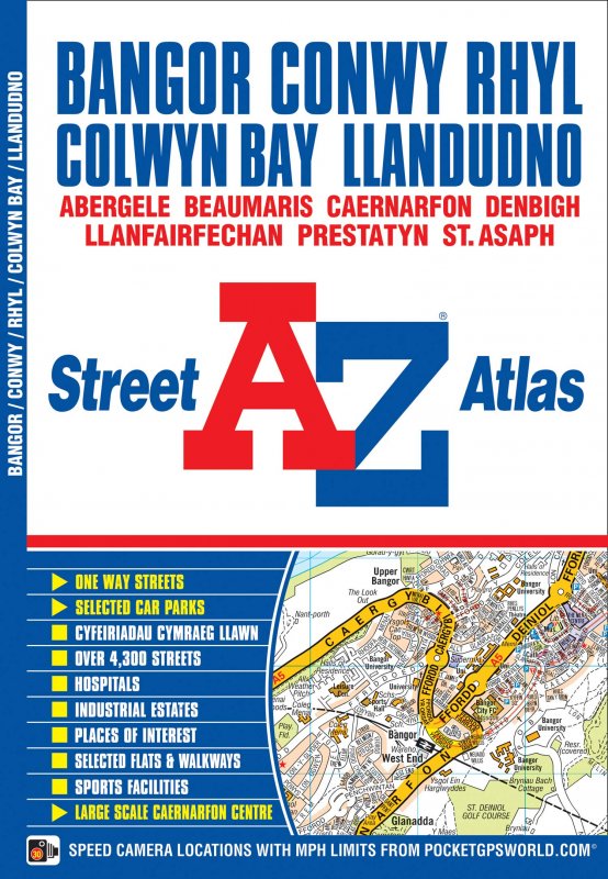 This atlas contains 37 pages of coloured street mapping that cosists of separate coverages of: Bangor, Beaumaris (Biwmares), Menai Bridge (Porthaethwy) and Llanfair Pwllgwyngyll. Llanfairfechan, Penmaenmawr and Dwygyfylchi. Conwy, Llandudno, Penrhyn Bay (Bae Penrhyn), Colwyn Bay (Bae Colwyn), Abergele, Kinmel Bay (Bae Cinmel), Rhyl (Y Rhyl), Prestatyn, Rhuddlan, Dyserth, Bodelwyddan and St. Asaph (Llan-Elwy). Denbigh (Dinbych). Caernarfon including a large scale town centre plan. Postcode districts, one-way streets and safety camera locations with their maximum speed limit are featured on the street mapping. The index section of the atlas lists streets and selected flats, walkways and places of interest, place and area names, hospitals and hospices covered by this atlas. |