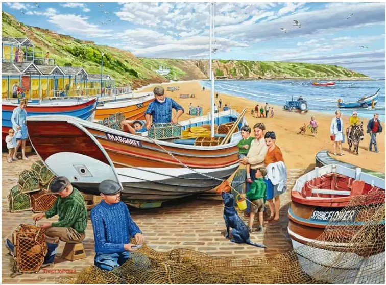It’s a bright day on the beach at Filey, with local fisherman making the most of the good weather and repairing their nets and preparing for the next fishing trip. Further down the beach another boat is being brought up to shore, a kiddie is enjoying a donkey ride and families stroll along the sand. Despite this being a nostalgic scene, traditional fishing still happens in this picturesque seaside town. High quality 500 piece cardboard jigsaw puzzle. The finished puzzle measures 49 x 36 cm when complete. Suitable for ages 10 years and up. Made from strong premium grade cardboard, with linen finish print to minimise glare on puzzle image. |