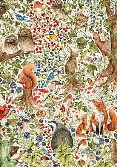 Owls, robins and finches perch on branches, while a mother fox and her pup enjoy the falling snow, a wise badger contemplates the change of season and a mischievous squirrel nibbles on a nut.