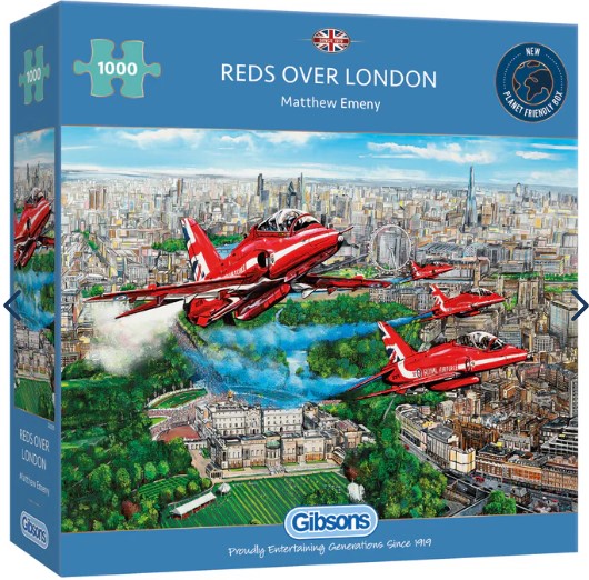 In this vibrant puzzle design, the Reds, are performing a flypast over Buckingham Palace. All nine jets take part, and in this scene four are in view from the right side of the formation.