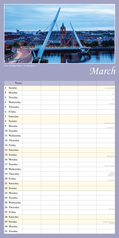 Enjoy wonderful scenic images throughout the year with our range of 2026 calendars. This 24 page wall calendar offers a full page for an image and a full page of date boxes below. The calendar dimensions are 30cm x 30cm (60cm x 30cm when opened). The grid contains columns for family members to keep track of everyone's appointments and engagements. The stunning images of Northern Ireland included are: Beaghmore Stone Circles; Carrick-a-Rede Rope Bridge, Ballintoy; Peace Bridge, Derry-Londonderry; Navan Fort, Armagh; Whitepark Bay, Ballycastle; Dunluce Castle; the Dark Hedges; Ballintoy Harbour; Giant's Causeway; Dundrum Bay towards Mourne Mountains; Altavaddy Bridge at Tollymore Forest Park; Titanic Belfast. Our 2026 Lomond Calendars are in plastic free packaging. |
